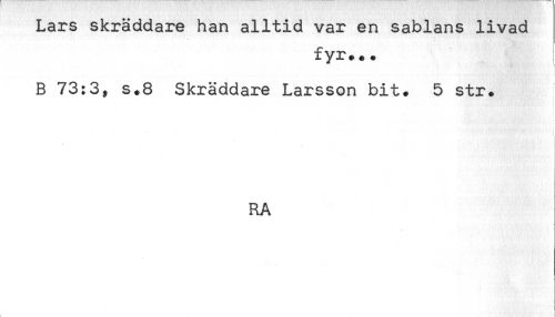 //// Lars skräddare han alltid var en sablans livad //// fyr... //// t //// B 73:3, s.8 Skräddare Larsson bit. 5 str. //// i //// RA ////
