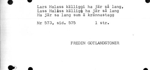 //// Lars Halass källiggi ha jär så lang, //// Lass Hal&ss källigg ha jär så lang //// Ha jär sa lang sum ä krännastagg //// ..... //// Nr 573, sid. 575 1 str. //// FREDIN GOTLANDSTONER ////
