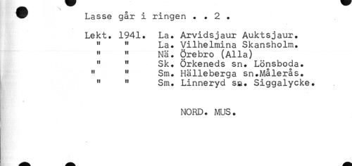 //// t //// * Lasse går i ringen . . 2 . //// Lekt. 1941. La. Arvidsjaur Auktsjaur. //// " " La. Vilhelmina Skansholm. //// " " Nä. Örebro (Alla) //// " " Sk. Örkeneds sn. Lönsboda. //// " " Sm. Hälleberga sn.Målerås. //// " " Sm. Linneryd sm. Siggalycke. //// NORD. MUS. ////