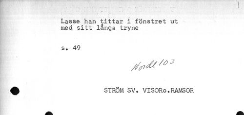 //// Lasse han tittar i fönstret ut //// med sitt långa tryne //// s. 49 //// HK ' //// ^ STRÖM SV. VISORo.RAMSOR ////
