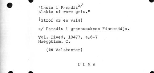 //// ^ "Lasse i Paradis*^ //// slakta si rare gris." //// (strof ur en vals) //// x/ Paradis i grannsocknen Finnerödja. //// Vgl. Tived, 18477, s.6-7 //// Haeggblom, C. //// (kV Valstexter) //// U L M A ////