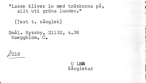 //// "Lasse kliver in med traskorna pa, { //// allt uti gröna lunden." //// (Text t. sånglek) I //// < //// Smål. Ryssby, 21132, s.38 ^ //// Haeggblom, C. ; //// r //// E //// i //// U LMM //// Sånglekar //// i //// ! //// i //// ^ ! ////