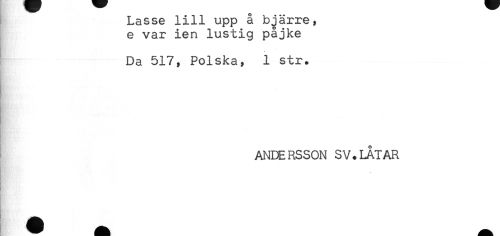 //// Lasse lill upp å bjärre, //// e var ien lustig påjke //// . //// < //// Da 517, Polska, 1 str. //// ANDERSSON SV.LÅTAR ////