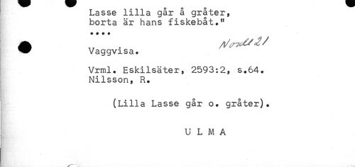 //// : Lasse lilla gar a gråter, //// borta är hans fiskebåt." //// . +.. //// ^^ Vaggvisa. //// Vrml. Eskilsäter, 2593:2, s.64. //// Nilsson, R. //// (Lilla Lasse går o. gråter). //// U L M A ////