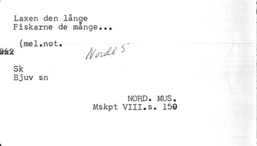//// Laxen den lån^e //// Fiskarne de mange... //// (mel.not. //// Sk //// Bjuv sn //// NORD. MUS. //// Mskpt VIII.s. 150 //// t //// ! ////