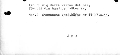 //// Led du mig Herre vartän det bär, //// för uti din hand jag säker är, //// 4:4.? Svenssons saml.häfte Nr iS 17,s.44. //// < //// ! //// ! //// ! //// ÅBO ////