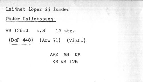 //// Leijnet löper ij lunden //// Peder Pallebosson //// VS 126:3 s.3 15 str. //// (DgF 448) (Arw 71) (Visb.) //// AFZ MS KB //// KB VS 126 ////
