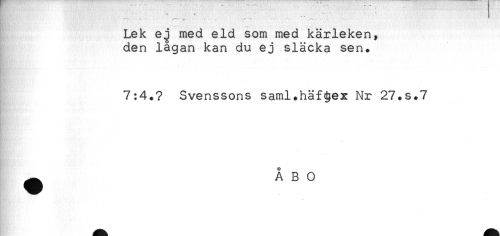 //// ----- - - . - - //// < . //// Lek ej med eld som med kärleken, //// den lågan kan du ej släcka sen. //// 7:4.? Svenssons saml.häf<t?ex Nr 27.s.7 //// ^ ÅBO ////