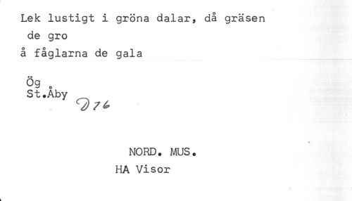 //// Lek lustigt i gröna dalar, då gräsen //// de gro //// å fåglarna de gala //// 09 . //// St.Aby ^ //// NORD. MUS. //// HA Visor ////