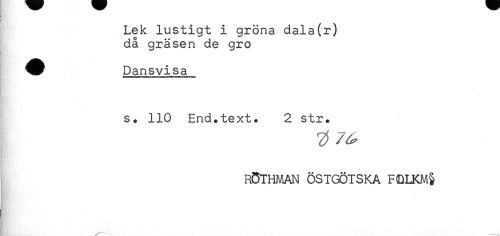 //// i //// t //// Lek lustigt i gröna dala(r) //// då gräsen de gro //// ^^ Dansvisa //// ! //// s. 110 End.text. 2 str. //// B* //// { //// RÖTHMAN ÖSTGÖTSKA F(DLKM§ //// t ////