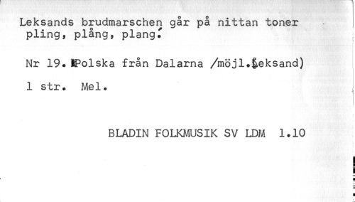 //// Leksands brudmarschen går på nittan toner //// pling, plång, plang^ //// Nr 19. KPolska från Dalarna /möjl.Leksand) //// 1 str. Mel. //// " //// BLADIN FOLKMUSIK SV LDM 1.10 //// ) //// t //// } //// a //// s ////