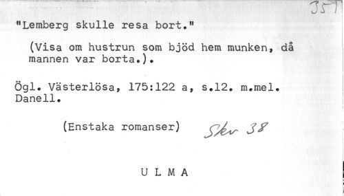 //// "Lemberg skulle resa bort." //// ' ^ . . ' <. //// (Visa om hustrun som bjöd hem munken, då //// mannen var borta.). //// ^ < //// Ögl. Västerlösa, 175:122 a, s.12. m.mel. ! //// Danell. ! //// (Enstaka romanser) //// U L M A I //// t //// i- ////