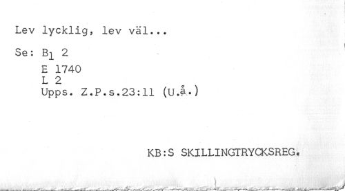 //// Lev lycklig, lev väl... //// Se: Bi 2 //// E 1740 //// L 2 //// Upps. Z.P.s.23:ll (U.å.) //// KB:S SKILLINGTRYCKSREG. //// \ ////