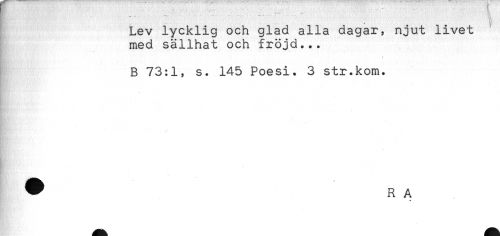 //// Lev lycklig och glad alla dagar, njut livet //// med sällhat och fröjd... //// B 73:1, s. 145 Poesi. 3 str.kom. ////