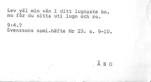 //// Lev väl min vän i ditt lugnaste bo, //// nu far du sitta uti lugn och ro. //// 9:4.? //// Svenssons saml.häfte Nr 23. s. 9-10. ////