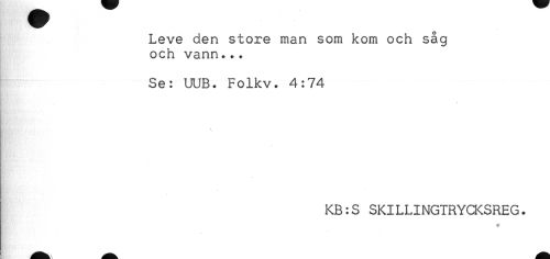 //// Leve den store man som kom och såg //// och vann... //// Se: UUB. Folkv. 4:74 //// KB:S SKILLINGTRYCKSREG. //// * ////