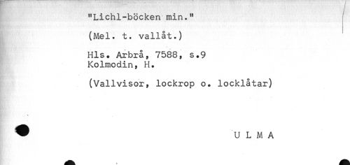 //// "Lichl-böcken min." //// (Mel. t. vallat.) //// L .. ....... . ..... //// Hls. Arbrå, 7588, s.9 //// Kolmodin, H. //// - //// (Vallvisor % lockrop o. locklåtar) //// .. * //// ^ U L M A ////