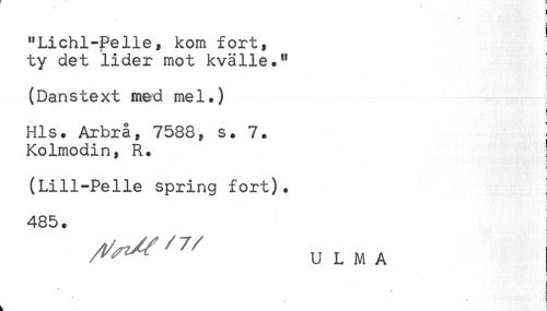 //// "Lichl-Pelle, kom fort, //// ty det lider mot kvälle." i //// i //// (Danstext med mel.) //// Hls. Arbrå, 7588, s. 7. //// Kolmodin, R. //// (Lill-Pelle spring fort). ; //// i //// ! //// 485. //// ULM A //// r //// ^ ! ////