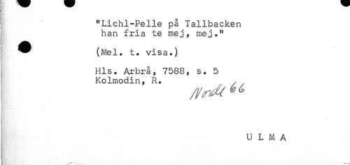 //// "Lichl-Pelle på Tallbacken //// han fria te mej, mej." //// * (Mel. t. visa.) //// Hls. Arbrå, 7588, s. 5 //// Kolmodin, R. //// * //// U L M A ////