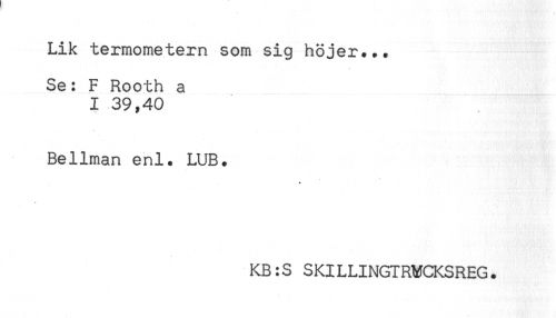 //// Lik termometern som sig höjer... //// Se: F Rooth a //// I 39,40 //// Bellman enl. LUB. //// * //// KB:S SKILLINGTRWCKSREG. ////