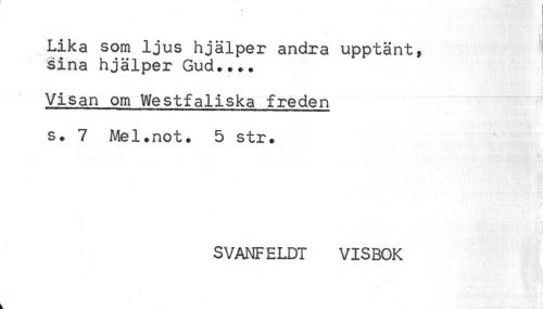 //// Lika som ljus hjälper andra upptänt, //// sina hjälper Gud.... //// Visan om Westfaliska freden //// s. 7 Mel.not. 5 str. //// SVANFELDT VISBOK //// k ////