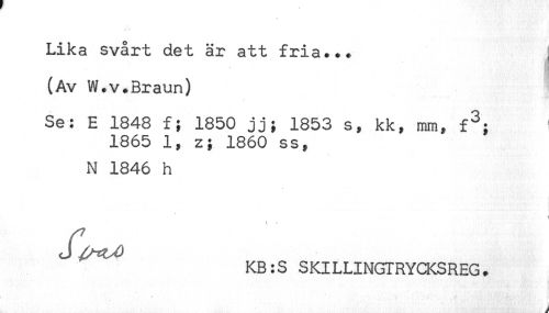 //// Lika svårt det är att fria... , //// . //// (Av W.v.Braun) //// Se: E 1848 f; 1850 jj; 1853 s, kk, mm, f^; //// 1865 1, z; 1860 ss, //// N 1846 h //// t //// KB:S SKILLINGTRYCKSREG. ////