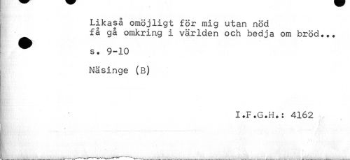 //// Likaså omöjligt för mig utan nöd //// få gå omkring i världen och bedja om bröd... //// s. 9-10 //// //// /i Näsinge (B) //// I.F.G.H.: 4162 //// Bsi-' * ////