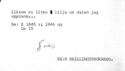 //// Liksom en liten § lilja ur dalen jag //// upprann!... //// Se: E 1845 r; 1846 qq //// Qc 15 //// KB:S SKILLINGTRYCKSREG. ////