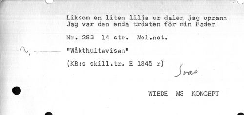 //// Liksom en liten lilja ur dalen jag uprann //// Jag var den enda trösten för min Fader //// Nr. 283 14 str. Mel.not. //// ^ — —------ "Wåkthultavisan" //// (KB:s skill.tr. E 1845 r) //// ^ WIEDE MS KONCEPT ////