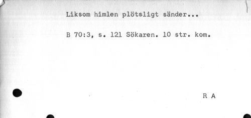 //// ! //// Liksom himlen plötsligt sänder... //// B 70:3, s. 121 Sökaren. 10 str. kom. //// - //// - ////