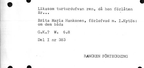 //// Likasom turturdufvan ren, då hon förlåten //// * w //// ar * + * //// Brita Maria Hankonen, förlofvad m. I.Kytös: //// om dem båda //// G.K.? W. 6.8 //// Del I nr 383 //// RANCKEN FÖRTECKNING ////
