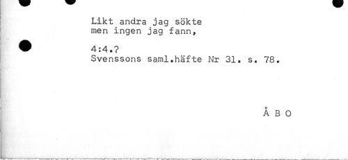 //// ! Likt andra jag sökte //// men ingen jag fann, //// # 4:4.? //// Svenssons saml.häfte Nr 31. s. 78. //// < //// ÅBO ////