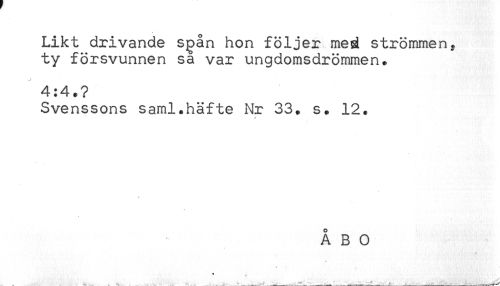 //// Likt drivande s^ån hon följer mest strömmen, //// ty försvunnen så var ungdomsdrömmen. //// 4:4.? //// Svenssons saml.häfte Nr 33. s. 12. //// t //// t ////