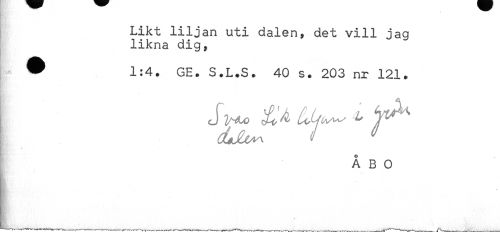//// Likt liljan uti dalen, det vill jag //// likna dig, //// ^ 1:4. GE. S.L.S. 40 s. 203 nr 121. //// ÅBO ////