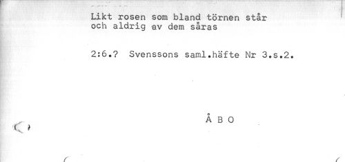//// Likt rosen som bland törnen står //// och aldrig -av dem såras //// 2:6.? Svenssons saml.häfte Nr 3.S.2. //// ÅBO //// t* ? ////