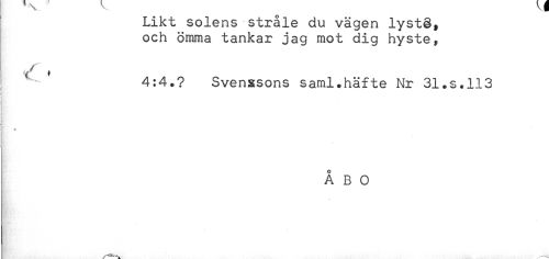 //// Likt solens stråle du vägen lyst§, //// och ömma tankar jag mot dig hyste, //// ! ^ ^ 4:4.? Svenssons saml.häfte Nr 31.s.113 //// ! //// { //// ÅBO ////