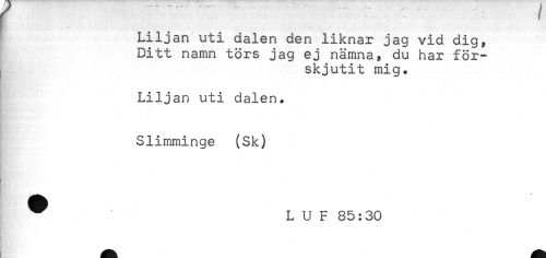 //// - //// f //// Liljan uti dalen den liknar jag vid dig, //// Ditt namn törs jag ej nämna, du har för- //// skjutit mig. //// Liljan uti dalen. //// Slimminge (Sk) //// ^ L U F 85:30 ////