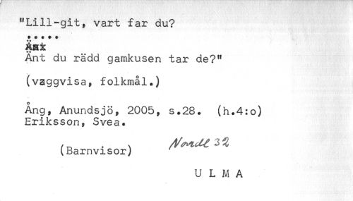 //// "Lill-git, vart far du? //// ***** //// ÄHk //// ** //// An t du rädd gamkusen tar de?" //// < //// (vaggvisa, folkmål.) //// Ång, Anundsjö, 2005, s.28. (h.4:o) //// Eriksson, Svea. //// (Barnvisor) //// U L M A ////