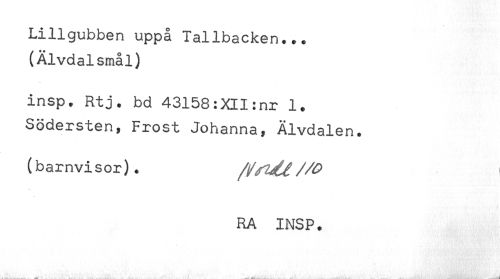 //// Lillgubben uppå Tallbacken... //// (Älvdalsmål) //// insp. Rtj. bd 43158:XII:nr 1. //// Södersten, Frost Johanna, Älvdalen. //// (barnvisor). //// RA INSP. ////