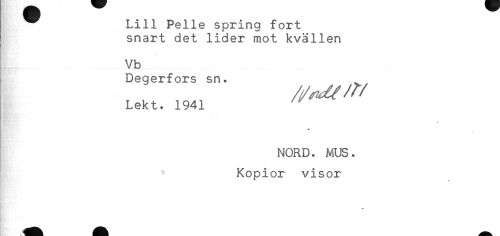//// Lill Pelle spring fort //// snart det lider mot kvällen //// Vb //// Degerfors sn. //// Lekt. 1941 ^ //// * //// * //// NORD. MUS. //// ! ^ Kopior visor ////