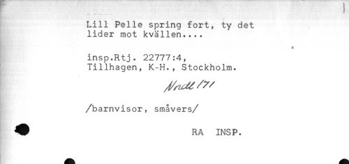 //// * //// ^ — . ——' //// Lill Pelle spring fort, ty det //// lider mot kvällen.... //// + //// insp.Rtj. 22777:4, //// Tillhagen, K-H., Stockholm. //// /barnvisor, småvers //// /^ RA INSP. ////