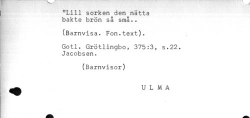 //// . //// "Lill sorken den nätta //// bakte bron så små.. //// (Barnvisa. Fon.text). //// Gotl. Grötlingbo, 375:3, s.22. //// Jacobsen. //// i (Barnvisor) //// ^ U L M A ////