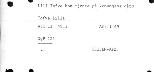 //// Lill Tofva hon tjente på konungens gård //// ['* * //// Tofva lilla //// ! Afz II 43:1 Afz I 49 //// DgF 121 //// - //// GEIJER-AFZ. ////
