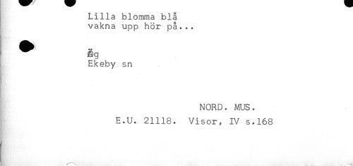 //// Lilla blomma blå //// vakna upp hör på... //// } Ekeby sn //// NORD. MUS. //// E.U. 21118. Visor, IV s.168 ////