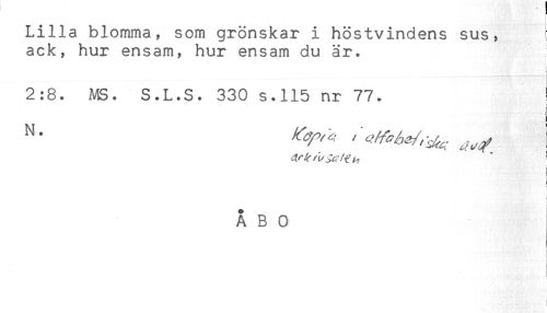 //// Lilla blomma, som grönskar i höstvindens sus, //// ack, hur ensam, hur ensam du är. //// 2:8. MS. S.L.S. 330 s.115 nr 77. ^ //// i //// ÅBO ////