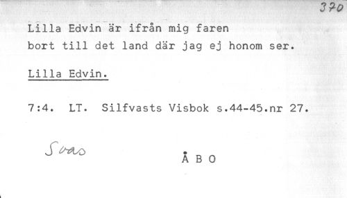 //// Lilla Edvin är ifrån mig faren //// bort till det land där jag ej honom ser. //// Lilla Edvin. //// 7:4. LT. Silfvasts Visbok s.44-45.nr 27. //// J //// A B O //// t ////