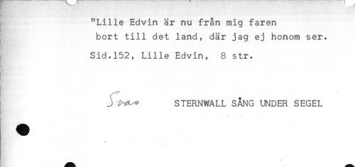 //// "Lille Edvin är nu från mig faren //// bort till det land, där jag ej honom ser. //// j Sid.152, Lille Edvin, 8 str. //// j STERNWALL SÅNG UNDER SEGEL //// * ////