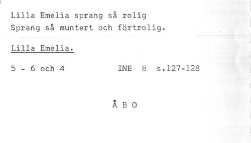 //// Lilla Emelia sprang så rolig //// Sprang så muntert och förtrolig. //// i //// . //// Lilla Emelia. //// — - ___ ___ //// 5 - 6 och 4 INE 8 s.127-128 //// ÅBO ////