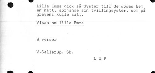 //// Lilla Emma gick så dyster till de dödas hem //// en natt, sörjande sin tvillingsyster, som på //// gravens kulle satt. //// . //// Visan om lilla Emma //// ------ //// //// /8 verser //// V.Sallerup. Sk. //// L U F ////