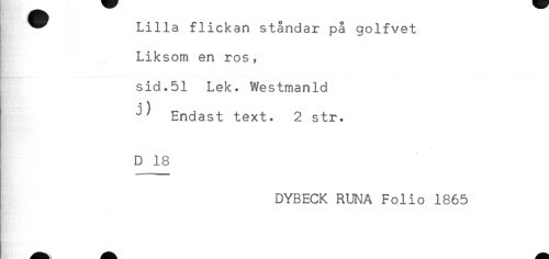 //// ^^ Lilla flickan ståndar på golfvet //// Liksom en ros, //// sid.51 Lek. Westmanld //// ' ^ ^ Endast text. 2 str. //// D 18 //// DYBECK RUNA Folio 1865 ////